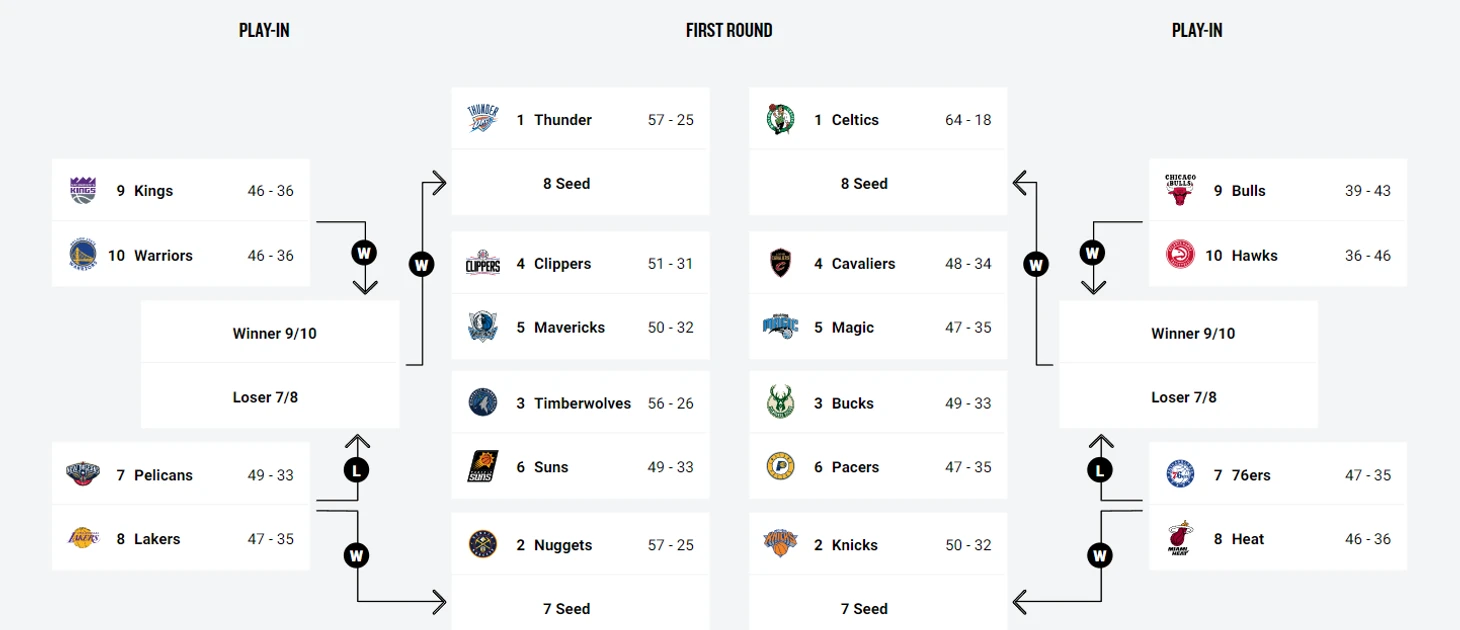 Гонка за 9-е и 10-е места на Западе особенно интригует, поскольку одна из команд «Маверикс», «Кингз» и «Санз» в конечном итоге пропустит плей-офф. Поэтому все три будут бороться изо всех сил в течение следующих двух недель за шанс продлить свой сезон. Тот, кто займет 9-е и 10-е места, встретится в матче плей-ин на вылет, а команда-победитель выйдет на проигравшего в матче 7-8 за шанс завоевать 8-е место и свидание с лидером посева «Оклахома-Сити Тандер».