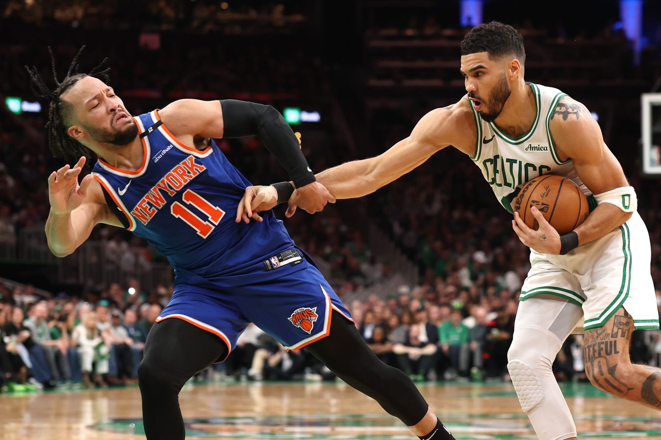 Большую часть первой игры “Бостон” довольно легко создавал себе открытые возможности для броска. Команда целенаправленно играла против Таунса и Брансона по отдельности, а в нескольких случаях даже задействовала обоих в одной атаке. “Никс” позволяли совершать открытые трехочковые из-за неправильных разменов, поздних ротаций и плохого выполнения самого процесса смены.